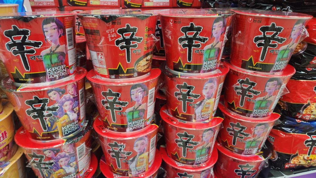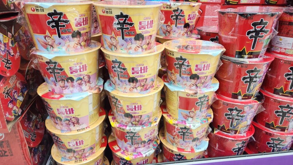 辛ラーメンで有名な食品会社「農心」では、キャラクターデザインされたラーメンやお菓子。